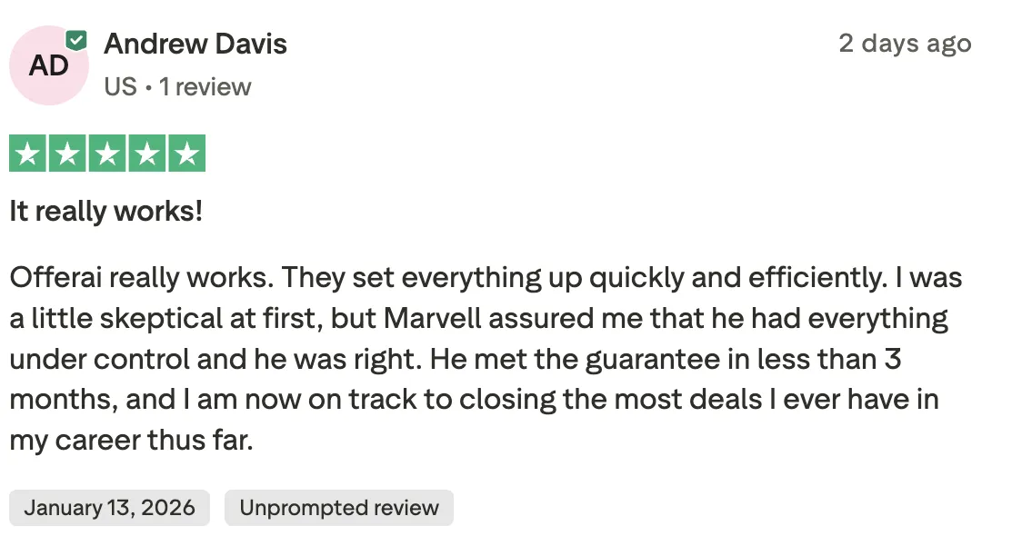 OfferAI Agents are proud of their success but never satisfied. Once they hit a goal, they are already leveraging their new systems to reach the next level. Their sights are always set on scalable, sustainable growth.